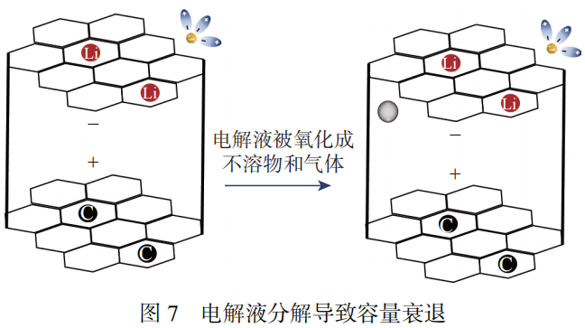 卢威等的研究表明,当工作电压超出电解液的电化学稳定窗口时,电解液会与正极材料间发生氧化分解反应。电解液与负极生成SEI膜,以及电解液在析锂时的反应过程,多结合其他形式的老化进行研究。电解液中的有机溶剂在电池工作期间会发生酯交换和聚合反应,LiPF6等导电盐会在反应中降解,形成有机磷酸盐和氟酸盐,Henschel等对5家汽车生产商的锂离子电池电解液的老化情况进行分析,发现随着锂离子电池老化,能量型电池和功率型电池中的电解液都会出现不同程度的损耗,LiPF6 的浓度出现明显下降。