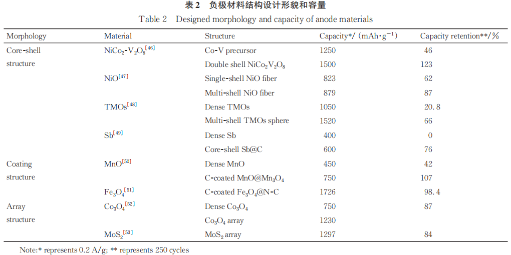 如前所述,负极材料在循环过程中的体积变化普遍很大,造成负极材料损坏和SEI膜破坏。因此,改善负极材料性能的首要方法是减小负极材料在循环过程中的体积变化和结构破坏。相较于微米颗粒,纳米尺寸颗粒不易断裂,有利于避免负极材料的结构破坏,阻止电解液的渗入。然而,纳米颗粒存在团聚倾向大、导电性差的问题。目前,常采用颗粒表面包覆、构造多壳结构和形成Li+通道等结构设计方法提高纳米负极材料的性能。这些方法均可以有效减小反复脱嵌锂过程的体积变化,保持SEI膜和电极结构的稳定,同时可以提高颗粒导电性、缩短锂离子传输路径、提高倍率性能。