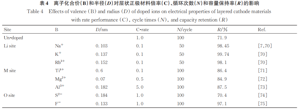 层状结构正极材料同样可分为Li位、TM位以及O位掺杂。Li位掺杂原子改变层状结构层间距的效果相较于橄榄石结构更加明显。Tao等发现适量的较大半径碱金属离子取代Li位后,降低了Li+和Ni2+的混排,同时增大了层间距并拓宽Li+的扩散通道,因此可提高倍率性能(见表4)。而TM位和O位的原子掺杂更加多样化,例如Zr、Mg、Al、Cr、Ti、Co等替换TM位原子或用F替换O位原子。如表4所示,这些原子的掺杂通过提高晶格键能,抑制了过渡金属向Li+层迁移发生的层状结构向尖晶石结构相变,从而阻止了充放电过程中正极颗粒的开裂和产气。而对表4中不同掺杂位点性能的比较可知K+、Al3+、F-对Li位、TM位以及O位的共掺杂有望实现最高的循环稳定性。