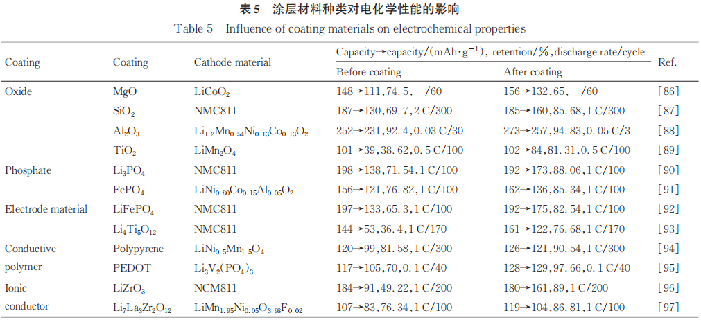 表5总结了涂层材料种类对电化学性能的影响。正极材料表面包覆后电池的容量保持率普遍提高;然而初始容量在包覆前后仅有小幅度的提升,这与包覆材料隔绝正极与电解液的接触、减少活性锂消耗并形成SEI膜有关。仅从表中的数据来看,电极材料包覆后容量保持率提升最小,而导电聚合物提升最大,这是由于电极材料难以形成薄而均匀的包覆层,而导电聚合物可以形成薄而均匀的包覆层,虽然两种材料均有优异的电导率,但是包覆后正极材料的电化学性能差异明显。因此,正极材料包覆不能仅关注包覆材料的电学性能,还要考虑其包覆后正极材料的电化学性能。