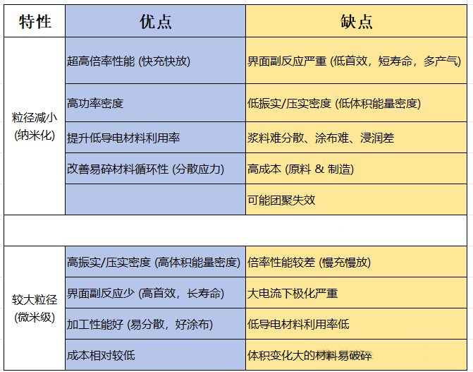 锂电池材料粒径(尤其是活性物质颗粒)的减小(纳米化)会带来一系列显著的优点和缺点,需要根据具体应用场景(如追求能量密度、功率密度、循环寿命或成本)进行权衡。以下是详细的优缺点分析: