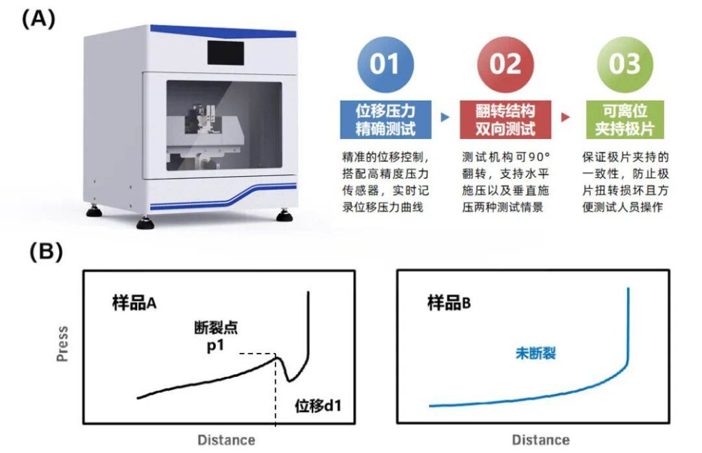 即将极片特定角度弯曲后固定在测试装置上,然后通过施加位移来使极片发生形变,测量极片在不同形变程度下的应力和应变(压力-位移),评估极片柔韧性。如图3B所示,优质极片(样品B)曲线平滑如丝绸,劣质品(样品A)则出现断裂突变点,差异一目了然!