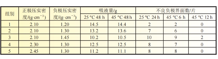 选取2.4 节中相同面密度、不同压实密度的正负极极片,隔膜为常规12μm PE隔膜,组成4Ah的软包装叠片电池,层数为26层正极、27层负极。首先对干电芯进行吸液实验,吸液时间为48h,温度分别为25和45℃,得到不同组别的吸液量。再对剩余电池进行注液,注液量均保持为(15±0.5) g,然后在不同的条件下(25℃ 24h、45℃ 6h、45℃ 12h)浸润,最后对电池进行化成,满充拆解界面。统计不同组别的不良负极界面(黑斑,析锂)的数量。
