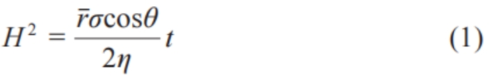正负极极片和隔膜都是多孔结构,可以等效为具有不同孔隙的毛细管结构。而电解液在多孔正极、负极以及隔膜内的浸润过程,可以理解为毛细管吸收效应。Lucas -Washburn渗透模型用来描述极片吸液动力学,如公式(1)所示。