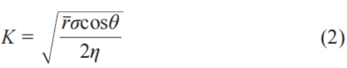 式中:H为吸液高度;t为吸液时间;r-为形式半径;σ为液体的表面张力;Θ为接触 角;η为液体粘度 。由Lucas -Washburn方程可以看出,液体浸润高度H的平方和吸液时间t成正比,定义浸润高度H的平方和吸液时间t的比率K为浸润速率。其中r-与毛细管形状系数c和平均毛细管半径r相关,如公式(3)所示: