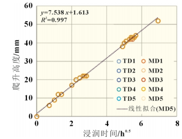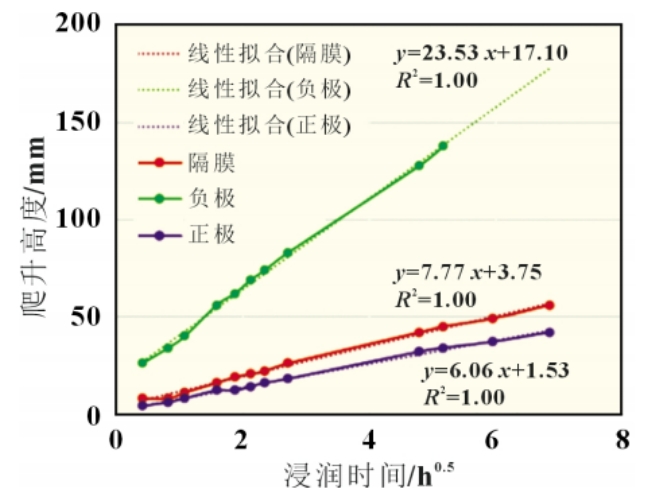取磷酸铁锂正极片10个,分别在横向(TD)和纵向(MD)方向进行不同时间的浸润爬升测试,得到如图2所示数据。可以发现在不同吸液方向TD/MD下,不同的爬升高度和浸润时间t0.5成线性关系,且拟合 R2为 0.997,精度较好。另外,TD 方向5个样品、MD方向5个样品重合性较好,证明极片TD和MD方向浸润无差异。装置整体可靠性较好。浸润高度和时间关系符合 Lucas-Washburn公式。