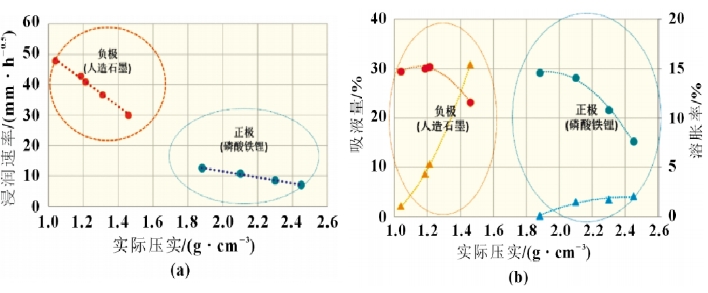 极片压实密度是电芯的关键设计参数。不同的压实密度对应不同孔隙率,对电池性能有关键的影响。对正负极极片在不同压实密度下进行电解液浸润速率和吸液量的测试,得到图4所示结果。