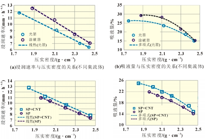 图5 不同集流体和不同正极配方下的压实密度和浸润速率以及吸液量的关系对比