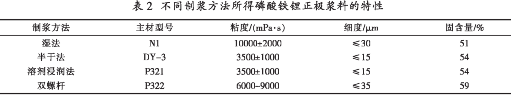 以磷酸铁锂作为正极主材,搭配导电剂SP、粘结剂PVDF进行浆料制备,部分功率型产品会考虑添加导电性更佳的导电胶液CNTs。表2为不同制浆方法所得磷酸铁锂正极浆料的特性。