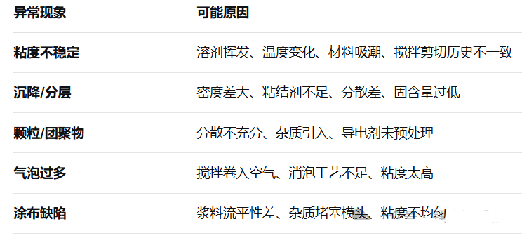 锂电池浆料异常通常涉及材料、工艺、环境等多方面因素,以下是常见原因的分类总结: