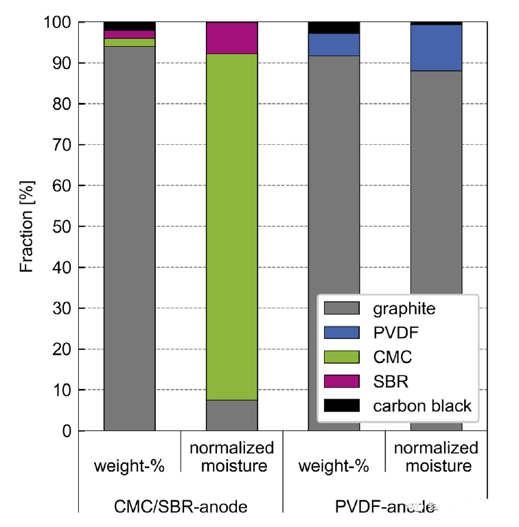 将极片静置24小时后,测量极片中不同组分的水含量,水分在极片中的比重,可以参看下图: