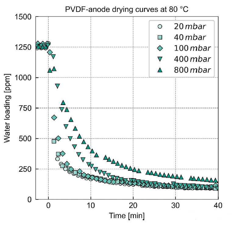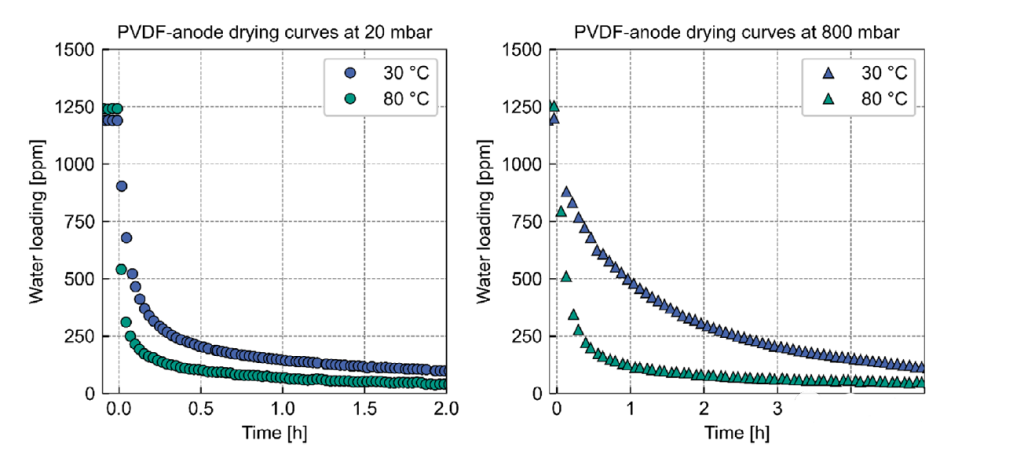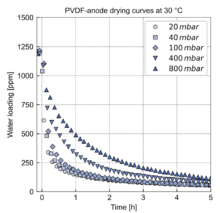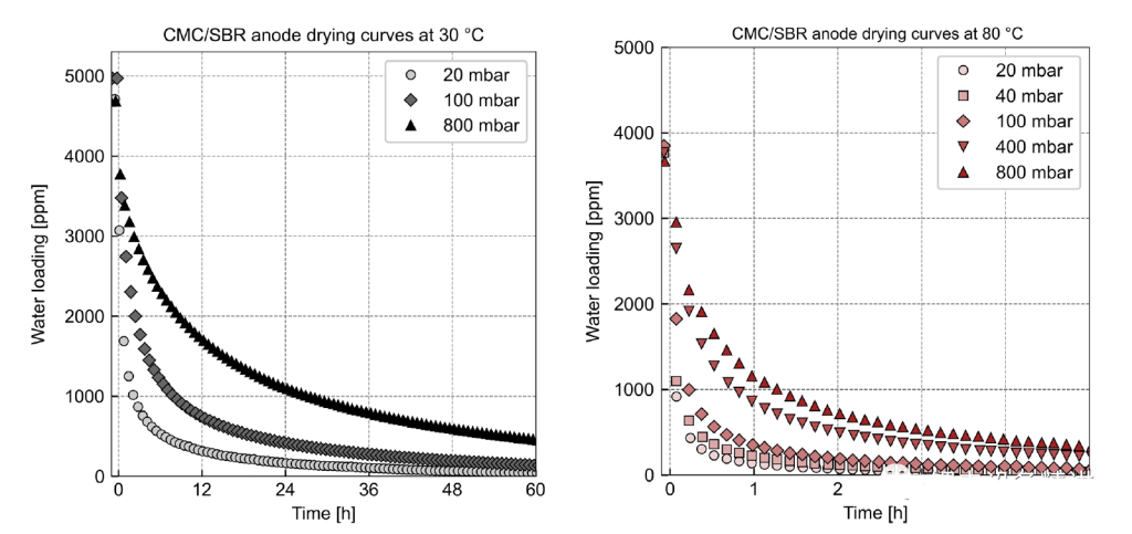 在30 ~ 80℃的温度范围内,水在CMC和SBR中的扩散系数变化了两个数量级。因此,聚合对CMC/SBR阳极干燥的影响预计在30℃时最为显著,因为在这种低温下,CMC中的水的扩散系数非常低。压力不影响聚合物中的扩散。因此,如果压力不影响CMC/SBR阳极的干燥,只有水在聚合物中的扩散决定干燥。如果压力影响干燥,那么通过多孔气相的质量传递也影响干燥。