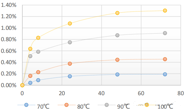 如下图,该款隔膜在100℃的条件下,20h后,收缩率超过1%,会对电池造成较为严重的影响。