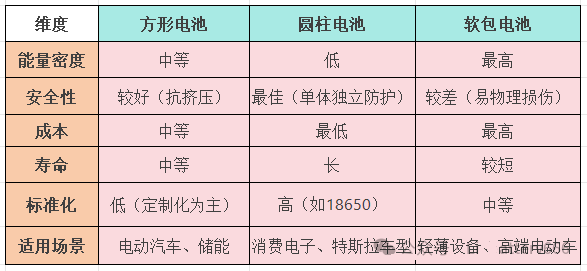高空间利用率:形状规则,成组效率高,适合大容量需求(如电动汽车)。