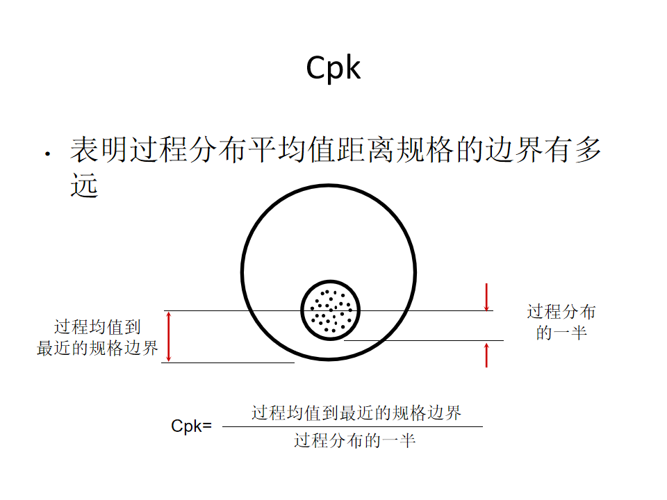 公式:CPK = min[(USL−μ)/3σ, (μ−LSL)/3σ],USL/LSL:规格上限/下限,μ是过程均值,σ是过程标准差。