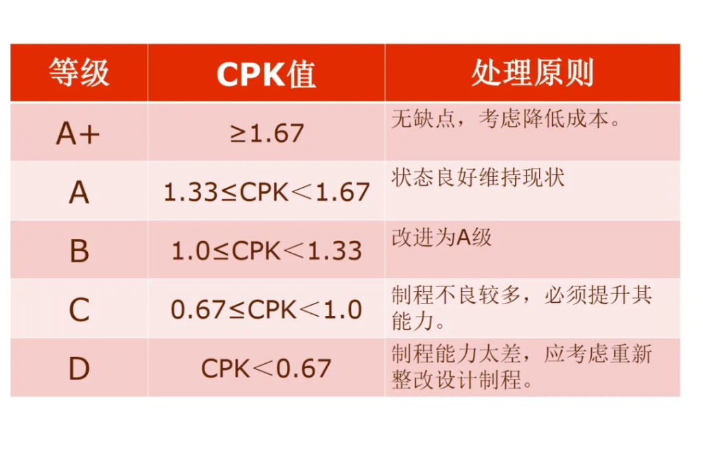 用于衡量一个生产过程在满足规格要求方面的能力。它综合考虑了过程的均值与规格中心的偏离程度以及过程的离散程度。CPK 值越大,表明生产过程越能稳定地生产出符合规格要求的产品。