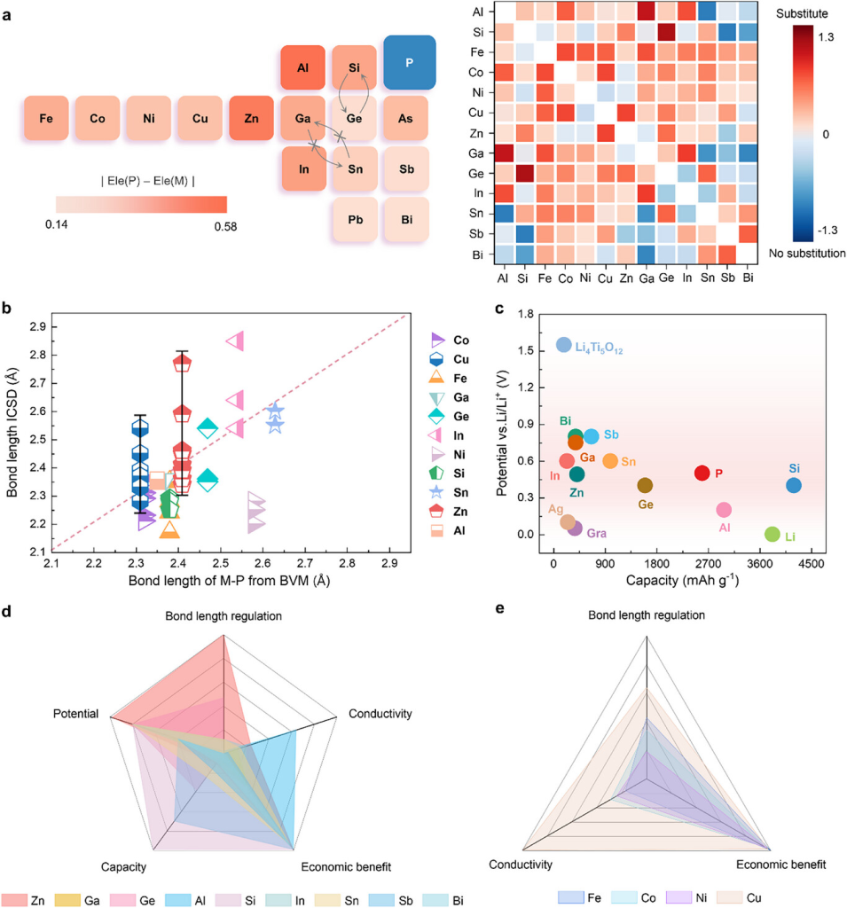 图1.高熵磷基材料的合理元素筛选a)左图:磷与元素周期表元素之间的电负性差异(Δχ,颜色标尺)。右图:以对数刻度(以10为底)显示的离子对的取代趋势。正值(红色)表示相互取代相容,而负值(蓝色)表示不取代相容。b)实验M─P键长(来自ICSD)与键价模型(BVM)计算的理论值。垂直偏差越大,阳离子软度越高。c)常见负极材料的理论比容量和嵌锂电位。红色区域标记了快速充电的最佳电位范围。d)锂活性元素的多参数评估,包括M─P键长分布(ΔL)、本征电导率(σ)、原材料成本(C)、理论容量(Q)和嵌锂电位(V)。e)惰性元素的多参数评估,包括M─P键长分布(ΔL)、本征电导率(σ)、原材料成本(C)