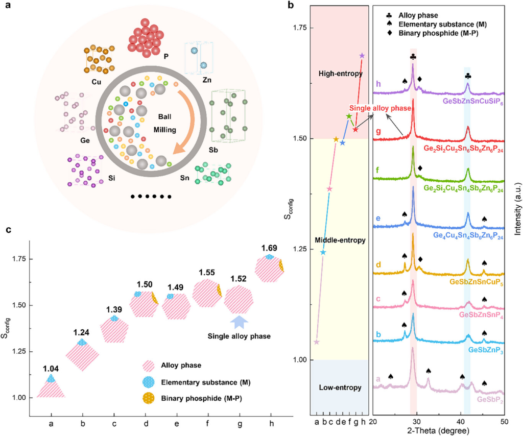 图2. 高熵磷化物的合成及熵值调控机理a)机械球磨合成高熵合金示意图:通过高能球磨将金属粉末(Zn、Sb、Si、Sn、Ge、Cu)与红磷合金化。b)多组分磷化物的构型熵计算(左)和XRD相演变(右)。c)基于(b)XRD图谱和各种磷化物合金构型熵计算的相演变示意图,显示了各组分的数量/化学计量和熵值。多边形的边数表示组分的数量。
