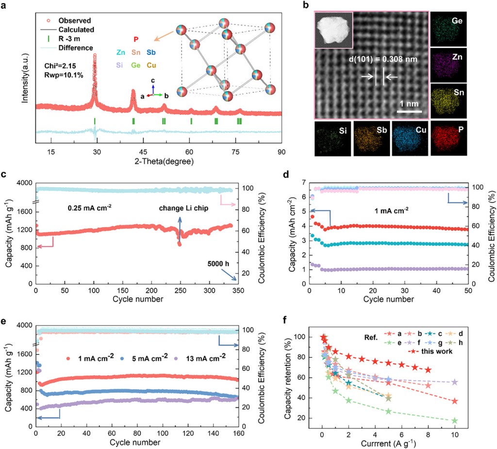 图3. 高熵磷化物(HEM)的表征与性能分析a)HEM的Rietveld精修XRD图和晶体结构示意图。b)HEM的HRTEM图和相应的EDS元素映射(Zn,Sb,Si,Sn,Ge,Cu,P)。c)HEM||Li半电池在0.25mAcm−2下的长期循环性能。d)在1mAcm−2电流密度下,不同负载水平(1、3和4mAhcm−2)的HEM||Li半电池的面积容量比较。e)不同电流密度(1、5和13mAcm−2)下HEM||Li半电池的高倍率循环稳定性。f)文献中HEM与传统磷化物的倍率性能比较。