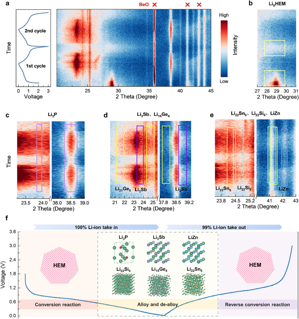 图4. 高熵磷基材料(HEM)的锂化/脱锂机理a)HEM在锂化/脱锂过程中的原位XRD图谱。b)HEM中主要衍射峰的演变。c)锂化/脱锂过程中Li3P的相演变。d)锂化/脱锂过程中Li3Sb和Li15Ge4的相演变。e)锂化/脱锂过程中Li22Sn5、Li22Si5和LiZn的相演变