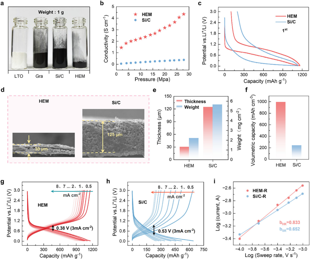 图5. HEM与传统商用材料物理和电化学性能对比a)振动密度对比:以1g质量为基准,HEM材料与石墨、钛酸锂、Si/C等商用负极材料的振动密度对比。b)HEM材料与商用Si/C负极材料的电导率测试结果。c)HEM与商用Si/C首次循环充放电曲线对比。d)截面形貌分析:电流密度0.5mAcm−2、面积容量3mAhcm−2时HEM与商用Si/C电极的SEM截面像。e)电极厚度与活性物质质量对比:面积容量3mAhcm−2时HEM与商用Si/C电极的厚度与活性物质质量分析。f)电极总体积容量对比:面积容量3mAhcm−2时,HEM与商用Si/C电极基于整个电极体积的体积容量对比。g)电流密度为0.5、1、2、3、4、5、6、7和8mAcm−2时HEM的充放电曲线。h)不同电流密度下商用Si/C的充放电曲线。i)HEM和商用Si/C的Log(i)与log(v)关系图。