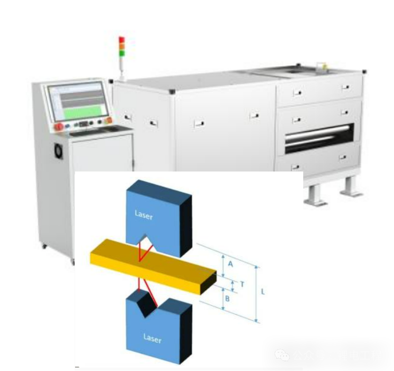 对射式、激光三角法。测厚模块由两个激光位移传感器上下对射的方式组成的,上下的两个传感器分别测量被测体上表面的位置和下表面的位置,通过计算得到被测体的厚度(L为2个激光位移传感器的距离,A为上传感器到被测极片距离,B为上传感器到被测极片距离,T为被测极片厚度,则T=L-A-B)