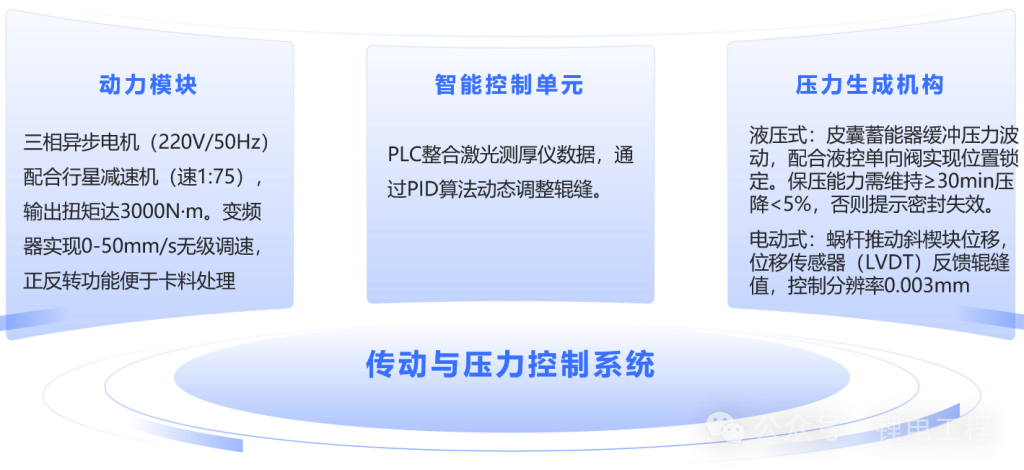 2.1辊压设备的本质是通过高强度压力和摩擦剪切力使极片材料发生塑性变形,其工作流程可分为四个连续阶段: