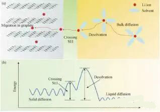 (2)溶剂化Li+到达固体电解质界面(SEI)表面,去溶剂化后进入SEI向石墨迁移;