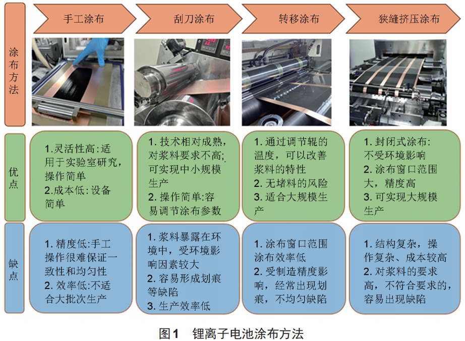 常见的锂离子电池涂布方法如图1所示,随着电池制造市场需求的提高,涂布方式也在不断发展,常见的涂布方式有手工涂布、刮刀涂布、转移涂布,到目前主流的狭缝式挤压涂布。电池极片涂布行业的发展旨在提高涂布质量和效率,以满足新能源行业对电池制造的需求。