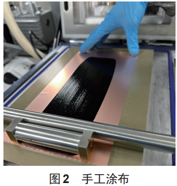 手工涂布是一种基于人工操作的涂布方法,其工作原理如图2所示,将待涂布的箔材放置在具有吸附性的平台上,将搅拌好的浆料均匀倒在平台一端,通过缓慢移动刮刀辊,将浆料均匀涂在箔材的表面,实现手工涂布。