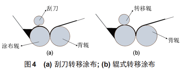 转移式涂布常见的有两种:刮刀转移涂布[图4(a)]以及双辊转移式涂布[图4(b)]。刮刀转移式涂布机结构相比于刮刀涂布机多了一个背辊。涂布原理相似,与之不同的是浆料是通过涂布辊与背辊之间的相逆转动将浆料转移到铜箔或铝箔上的。而双辊转移式涂布用转移辊替代了传统的刮刀,通过双辊之间的间隙调节浆料的转移量,然后再通过背辊与涂布辊的相逆转动达到涂布目的。