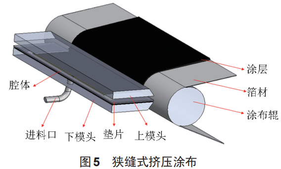 狭缝式挤压涂布工作原理如图5所示,在压力的作用下,将预先搅拌好的浆料以一定的流量通过进料口进入模头内部,在压力的作用下,将浆料均匀涂布在箔材表面。