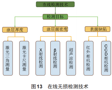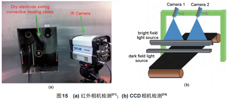 涂层表面缺陷检测方法有红外热成像检测[图15(a)、光学CCD相机检测[图15(b)]。红外热成像检测基于红外相机或传感器发出红外辐射,通过温度差异的原理检测涂层表面缺陷,可以实现在线检测。但是它不适用于高速生产环境,因为对检测设备、检测环境要求高,很容易受到环境温度的影响。光学CCD相机通过光学成像拍摄涂层表面的图像,通过图像处理算法识别相应的缺陷。