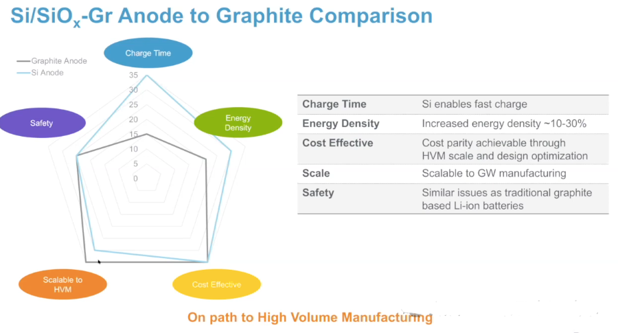传统液态锂离子电池使用石墨作为负极,1)石墨材料的理论克容量上限为372mAh/g,目前市面上高端石墨克容量已经可以达到360-365mAh/g,十分接近理论上限。而市面上普通的硅氧材料就能够达到1200mAh/g的克容量,远远高于石墨;2)石墨是2D层状结构,锂离子的嵌入方向是受限制,相比较于硅3个维度均能够快速嵌锂,硅负极更加适合大量锂离子短时间的嵌入,比石墨更加适合快充体系,是电车缩短充电时间的关键因素;3)石墨的嵌锂电位十分接近析理电位(~20mV vs Li/Li+),在快充时容易产生过电位,导致锂离子直接在石墨表面沉积变成金属锂,不仅损害电池使用寿命,更容易产生安全风险。硅的析理电位是石墨的两倍,大概在~400mV,在电池充电到70—80%SOC区间时,大倍率充电完全不需要担心锂沉积的危险。