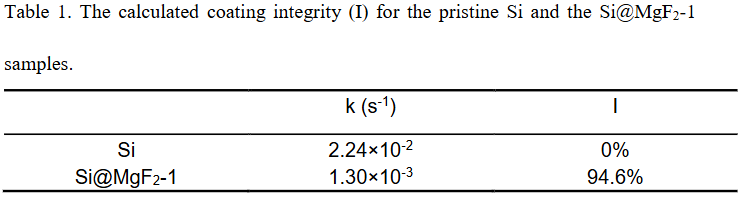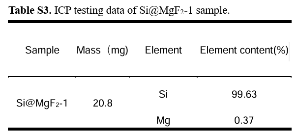 MgF2修饰硅纳米颗粒(SiNPs)样品的制备:晶体SiNPs(直径∼100nm)购自北京DK纳米材料有限公司。MgSiF6·6H2O购自Macklin并直接使用。首先,将0.5SiNPs分散到10g去离子水中。然后将24.75mgMgSiF6·6H2O溶解到所得混合溶液中。将混合溶液在60℃真空烘箱中干燥,得到样品Si@MgSiF6。将样品Si@MgSiF6放入氩气气氛的管式炉中,并在300℃下烧制2小时,得到样品Si@MgF2-1。为了比较,将MgSiF6·6H2O添加量分别为8.25mg和41.24mg的样品分别记为Si@MgF2-2和Si@MgF2-3。对于Si@MgF2-1样品,MgF2与Si的质量比为0.96%(表S3)。图S21展示了Si@MgF2-2和Si@MgF2-3在半电池中的循环性能。