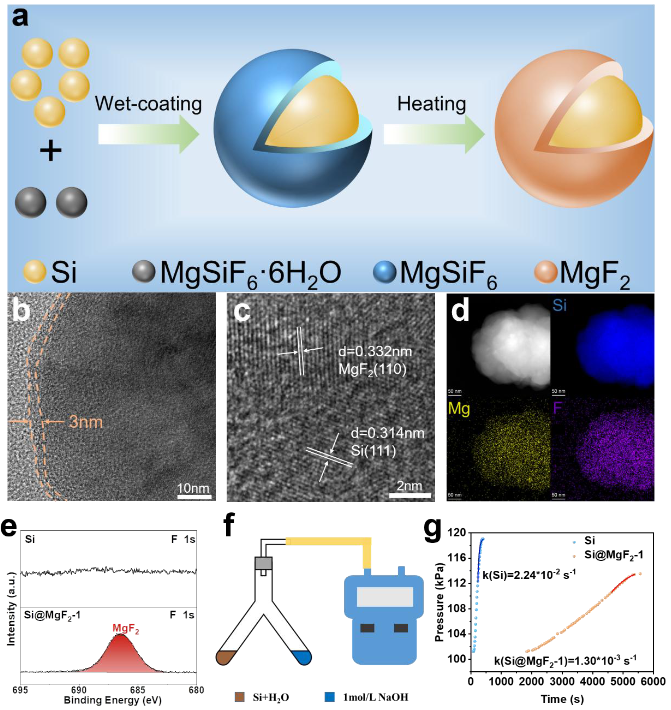 图1.(a)Si@MgF2样品制备示意图。(b-c)TEM图像。(d)Si@MgF2-1粒子的STEM图像及其对应的Si、Mg和F元素的EDS映射。(e)原始Si和Si@MgF2-1粒子的XPS光谱。(f)气体生产实验示意图。(g)压力随反应时间的变化。