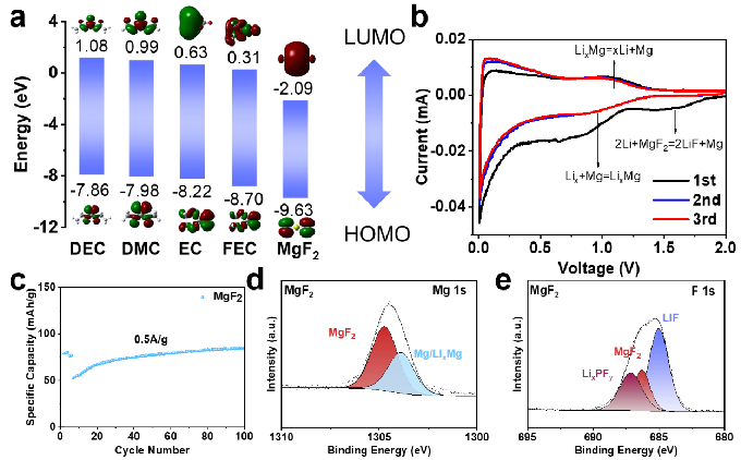 图2.(a)电解质溶剂和MgF2能级值的理论计算。(b)MgF2的循环伏安(CV)曲线。(c)MgF2阳极的循环稳定性。(d-e)3次循环后MgF2的XPS光谱。