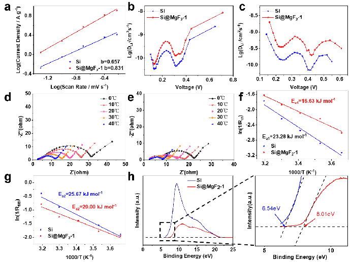 图4.(a)不同扫描速率下裸Si和Si@MgF2-1阳极CV曲线的扫描速率平方根与峰值电流密度的关系。(b-c)裸Si和Si@MgF2-1阳极的DLi+。(d)裸Si和(e)Si@MgF2-1阳极在不同温度下的EIS曲线。(f)60%DOD状态下(g)Rct和(h)RSEI的Arrhenius曲线和计算的活化能。(h)二次电子(Ecut-off)的全能量和放大截止能量的UPS谱。