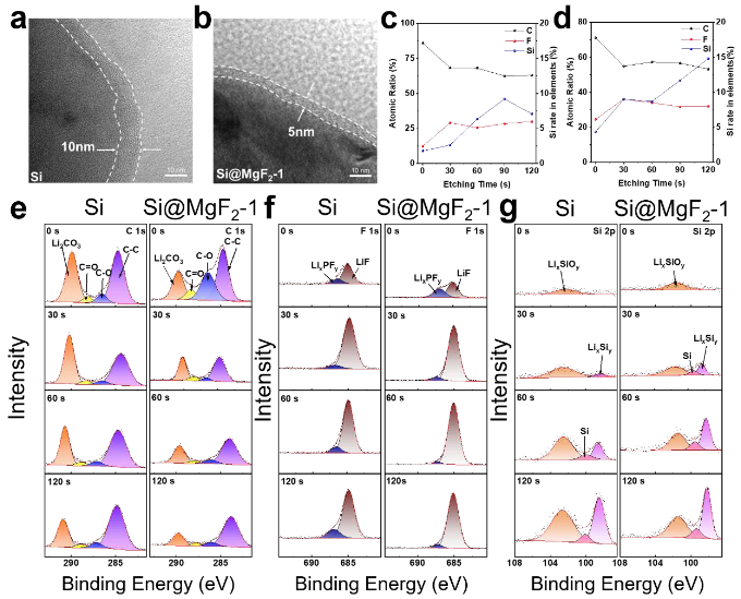 图5.(a)裸Si和(b)电池形成后的Si@MgF2-1的HRTEM图像。(c)Si和(d)Si@MgF2-1的C、F和Si信号的原子比随时间的变化。(e-g)Si和Si@MgF2-1阳极的深度XPS光谱。