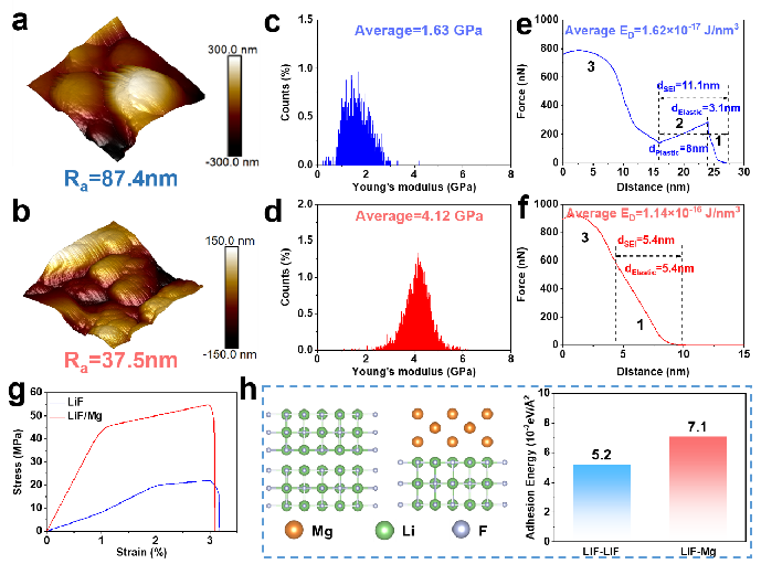 图6.(a,b)AFM3D图,(c,d)循环后裸Si和Si@MgF2-1负极的杨氏模量分布和(e-f)纳米压痕测试。(g)理论模拟:Mg掺杂LiF和纯LiF的应力-应变曲线。(f)LiF-LiF和Mg-LiF界面的粘附能。