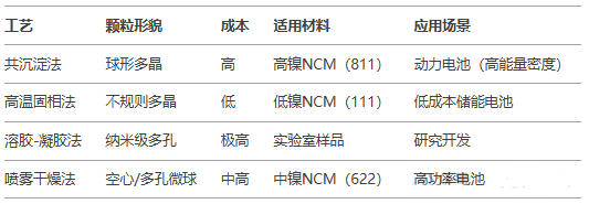 缺点:元素分布不均,颗粒粗大(微米级),容量和循环性能差,仅用于低端NCM(如NCM111)。