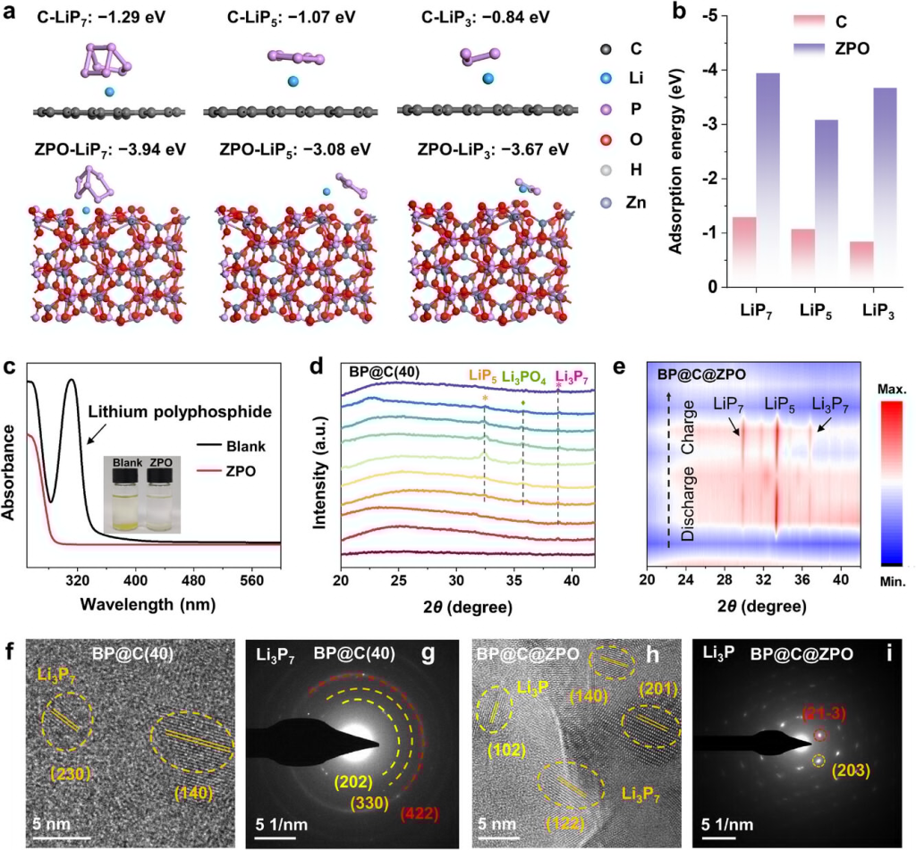 图4. 无定形ZPO对LiPPs吸附和BP基负极结构演变的影响。a)LiP7、LiP5和LiP3在导电碳和无定形ZPO表面的优化吸附构型示意图。b)(a)的吸附能比较。c)原始LiPPs溶液(左)和添加无定形ZPO后的溶液(右)的紫外-可见吸收光谱和相应的光学图像。d)BP@C(40)和e)BP@C@ZPO电极在不同放电和充电状态下收集的非原位XRD。从下到上,对电极进行原始状态取样,放电至0.7、0.52、0.37、0.16和0.01V,然后充电至0.5、1.0、1.2和3.0V。f,g)BP@C(40)和h,i)BP@C@ZPO电极完全放电至0.01V后的HRTEM图和相应的SAED图。