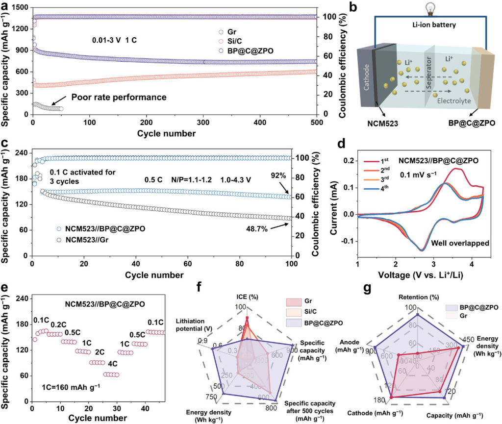 图5. 不同负极和全电池结构的电化学性能比较。a)Gr、Si/C和BP@C@ZPO负极在1C下的长期循环性能。BP@C@ZPO的比容量已根据复合材料的总质量进行归一化。b)由NCM523正极和BP@C@ZPO负极组成的组装全电池示意图。c)NCM523//BP@C@ZPO和NCM523//Gr全电池在1C下的循环性能。d)NCM523//BP@C@ZPO全电池在扫描速率为0.1mVs−1时的CV曲线。e)NCM523//BP@C@ZPO全电池在不同电流密度下的倍率性能。f)Gr、Si/C和BP@C@ZPO负极电化学性能比较的雷达图。g)雷达图比较了NCM523//Gr和NCM523//BP@C@ZPO配置的全电池性能。正极的比容量是根据NCM523活性材料的质量计算的,而全电池的比容量则根据负极和正极活性材料的总质量进行标准化。