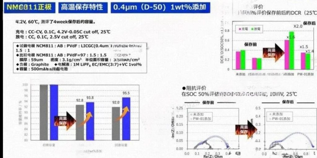 通过测试结果,我们可以看到氧化固态电解质在正极侧添加的优势:1)提高输出特性;2)增强低温特性;3)提高高温耐久性。