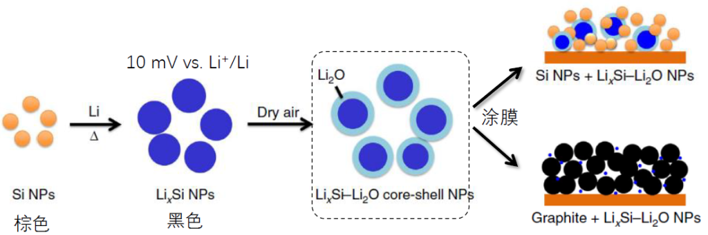 将硅与熔融锂反应或球磨,再对其表面进行包覆提升空气稳定性,将其添加于负极材料中锂化负极。其他材料如Sn、Ge也可应用。