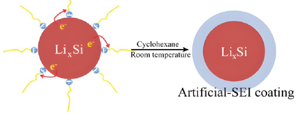 人造SEI包覆LixSi具有更高的稳定性和更强的锂化能力,氟化癸烷分子具有类表面活性剂的长链结构,溶于非极性溶剂中(LixSi也能稳定存在),而且可以在LixSi表面还原分解,形成人造SEI。