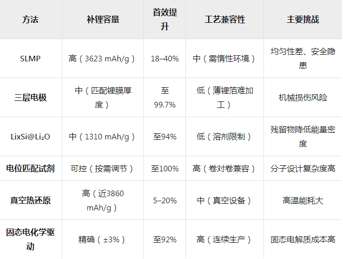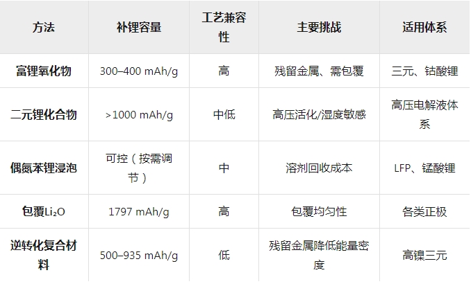 原理:在正极浆料中添加富锂氧化物,首次充电时释放锂离子补偿负极SEI膜损耗。