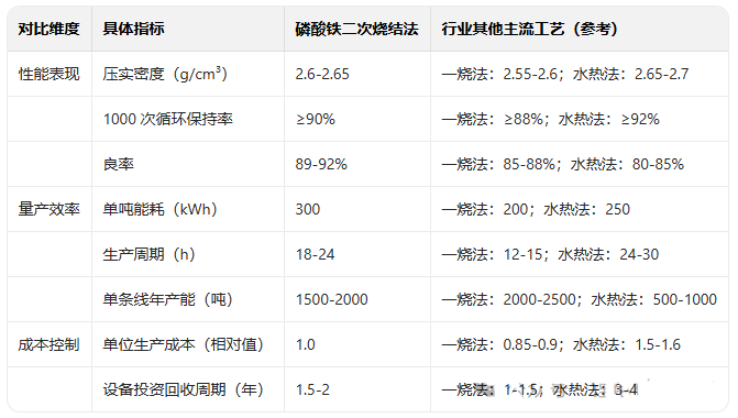 磷酸铁锂二次烧结法作为高压实磷酸铁锂(压实密度≥2.6g/cm³)的主流量产工艺,核心优势集中在性能稳定性、量产适配性,短板则体现在成本与效率层面,以下结合行业实际量产数据(良率、能耗、成本等)展开详细分析: