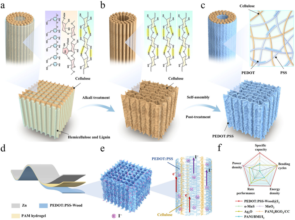 图1. PEDOT:PSS-Wood取向导电网络框架作为柔性ZPPWIB高性能正极.a–c)PEDOT:PSS-Wood框架制备过程示意图,a)天然轻木、b)化学处理木材和c)PEDOT:PSS-Wood框架的层次结构。d)柔性ZPPWIB结构示意图。e)PEDOT:PSS-Wood正极的层次导电网络结构。f)雷达图比较了柔性ZPPWIB与其他报道的利用水凝胶电解质的柔性锌离子电池的一系列特性,包括柔韧性、容量保持率、比容量、最大循环次数和能量密度。
