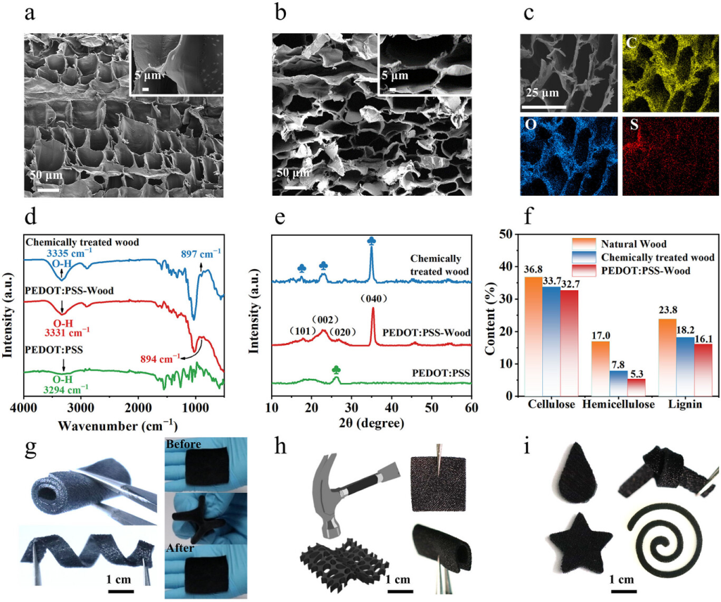图2. PEDOT:PSS-Wood骨架的表征。a)化学处理的柔性木材和b)PEDOT:PSS-Wood骨架的SEM图,插图为相应的放大SEM图。c)PEDOT:PSS-Wood骨架的元素映射。d)化学处理木材、PEDOT:PSS和PEDOT:PSS-Wood骨架的FT-IR。e)化学处理木材、PEDOT:PSS和PEDOT:PSS-Wood骨架的XRD。f)天然木材、化学处理木材和PEDOT:PSS-Wood骨架中纤维素、半纤维素和木质素的含量。g)PEDOT:PSS-Wood骨架在滚动、扭曲和抓握前后的照片。h)照片显示PEDOT:PSS-Wood框架在被锤子敲击(重量:5公斤)后的柔韧性。i)PEDOT:PSS-Wood框架的不同形状,包括水滴、星星、结和线圈。